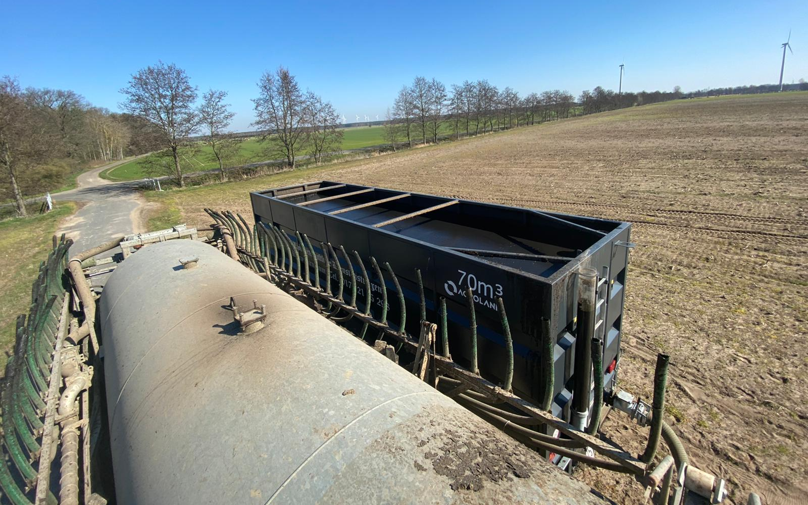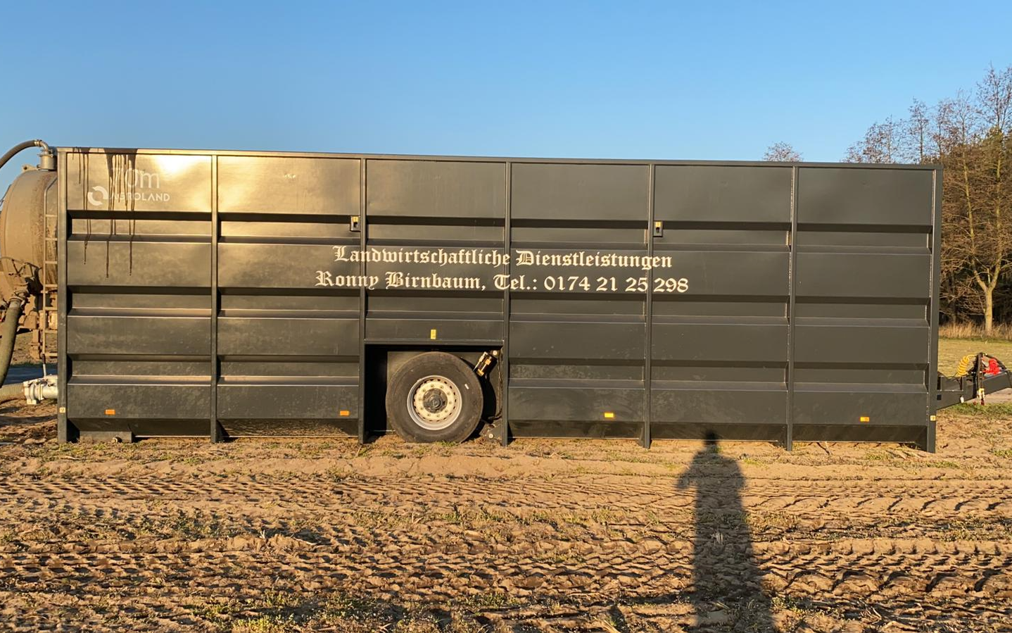 Zubringer zu klein/groß ? Fass zu klein/groß? Entfernung zu hoch oder nicht ausreichend Zubringer zur Verfügung? Egal welches Problem genannt wurde, wir haben die Lösung. Be smart - für das Jahr 2021, stellen wir unseren Güllecontainer mit 70m3 Volumen zur Miete zur Verfügung. Eine Absaugung auf 8 Zoll ist vorhanden, genauso wie eine Füll- und Entnahmemöglichkeit diese garantiert ein pausenloses Ausbringen und steigert die Menge pro Tag enorm! Auf Wunsch können die Zubringer von uns mit organisiert werden.