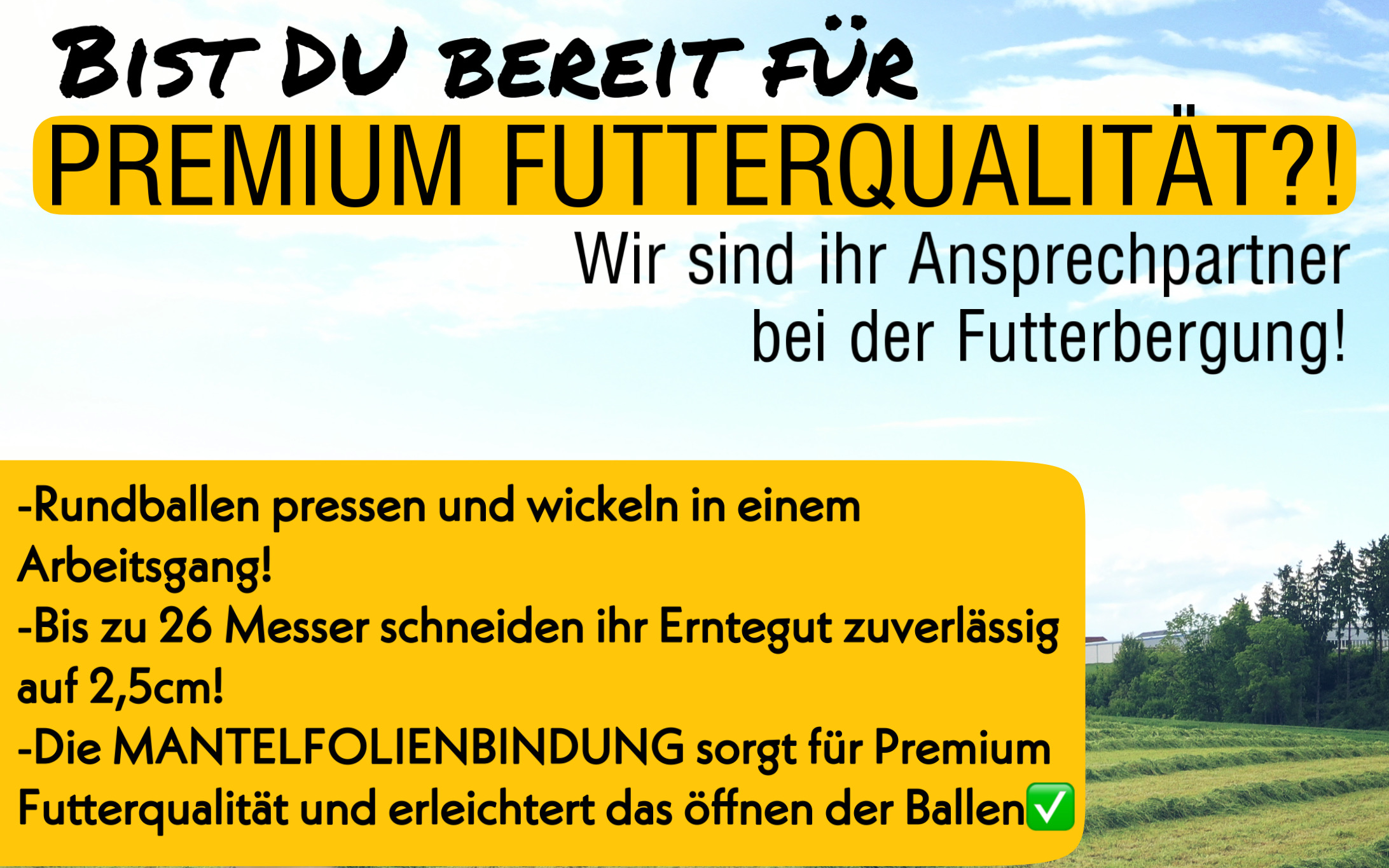 Wir haben für jeden Einsatz die passende Rundballenpresse! Sie haben die Wahl zwischen 3 verschiedenen Pressen: Krone Comprima CV150 XC PLUS, presst und wickelt ihre Ballen in einem Arbeitsgang / Krone Comprima V180 XC / Krone VariPack (Riemenpresse). Gerne bieten wir ihnen auch die Mantelfolienbindung an, somit erreichen Sie beste Futterqualität und profitieren von besseren Leistungen ihrer Tiere! Ihr Erntegut kann mit bis zu 26 Messer kurz geschnitten werden. Das Ballenmaß ist von 1-1,80 m verstellbar. Haben wir ihr Interesse geweckt? Rufen sie uns an! Wir freuen uns Ihren Auftrag im persönlichen Gespräch entgegen zu nehmen! Wir sind oberösterreichweit für Sie unterwegs!
